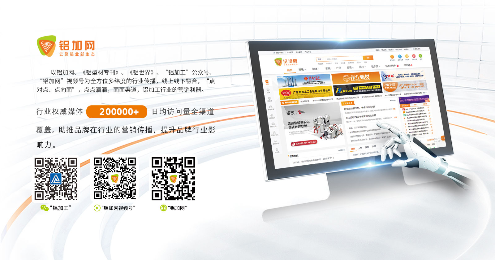 鋁加網(wǎng)(www.albiz.cn)是聞名鋁加工行業(yè)的垂直門戶網(wǎng)站,云聚鋁業(yè)新生態(tài),構(gòu)建鋁業(yè)新場景,以albiz.cn 網(wǎng)站為核心,以移動云端、鋁加工微信、鋁加網(wǎng)視頻號、《鋁型材專刊》和《鋁世界》雜志為載體,成為了鋁加工行業(yè)資訊和精準(zhǔn)傳播的首選傳媒。鋁加網(wǎng),采集和發(fā)布全行業(yè)信息資訊,提供線上展覽、在線直播、短視頻、品牌策劃、品牌運(yùn)營、品牌傳播等全方位的專業(yè)服務(wù)。